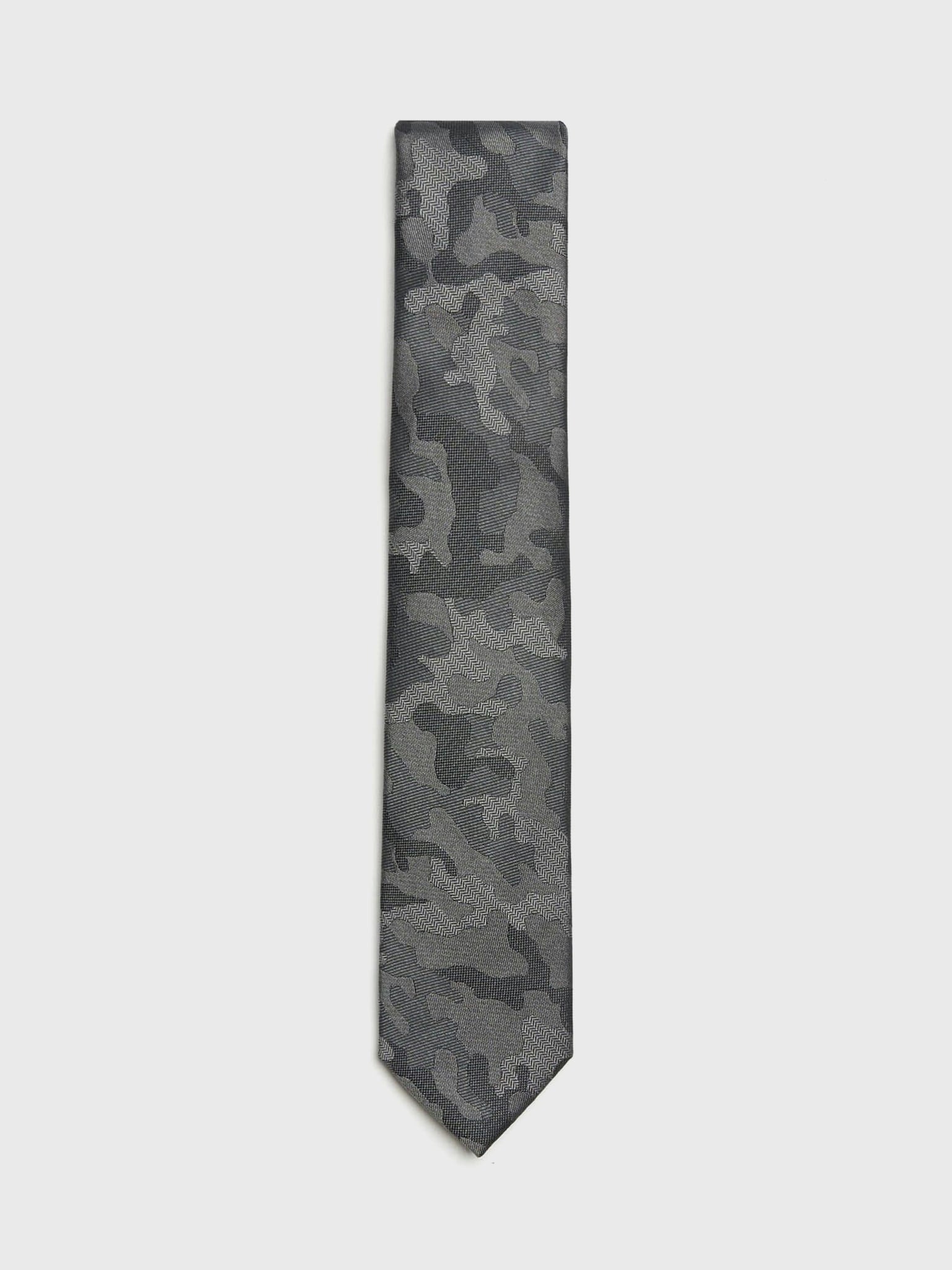 A sleek skinny tie featuring a bold camo pattern. The polyester construction ensures lasting wear while maintaining a crisp, professional appearance.