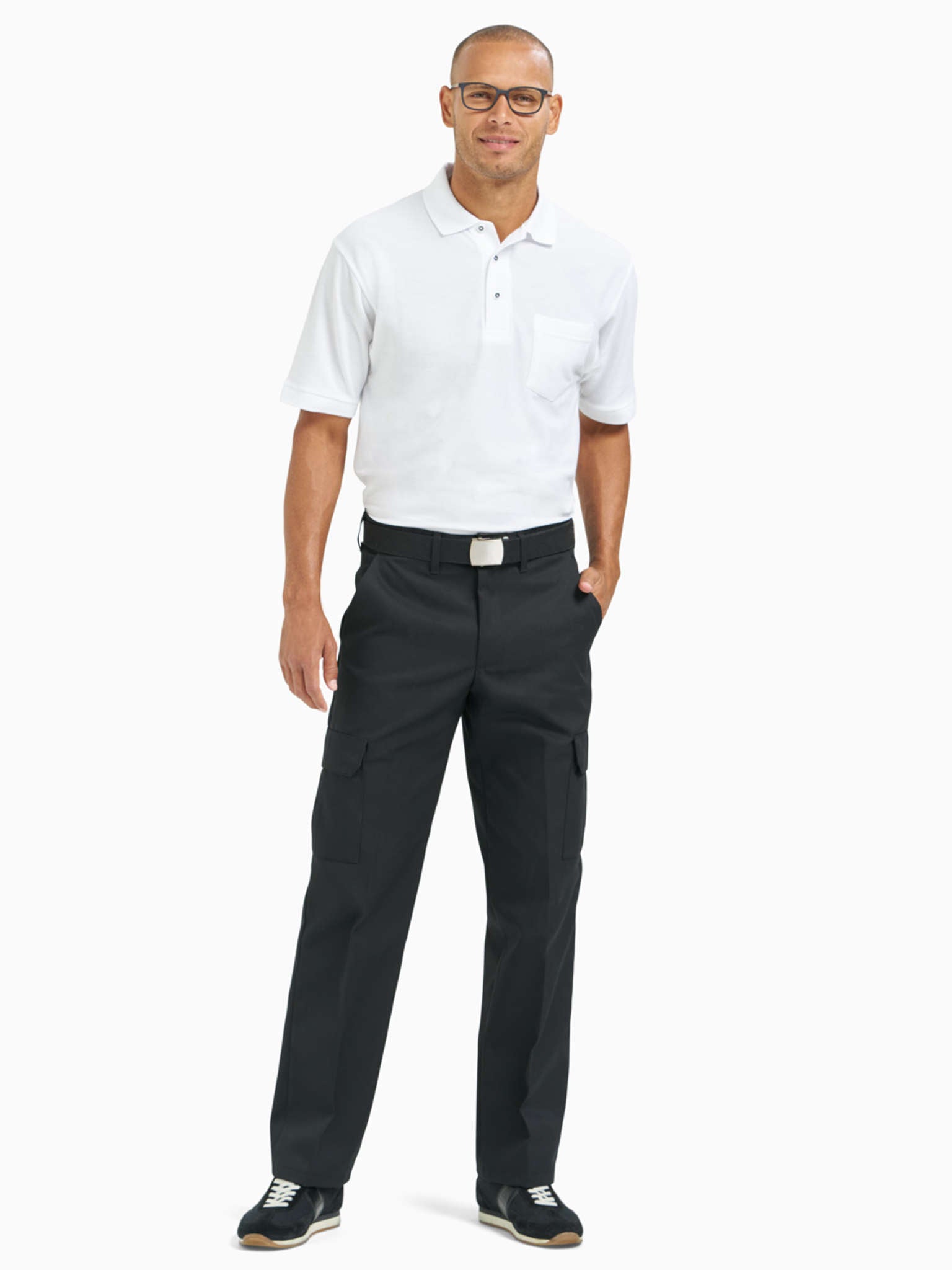These hardworking cargo pants combine professional polish with practical utility features. The durable twill fabric with soil-release technology ensures lasting performance through repeated industrial laundering while maintaining a sharp appearance.