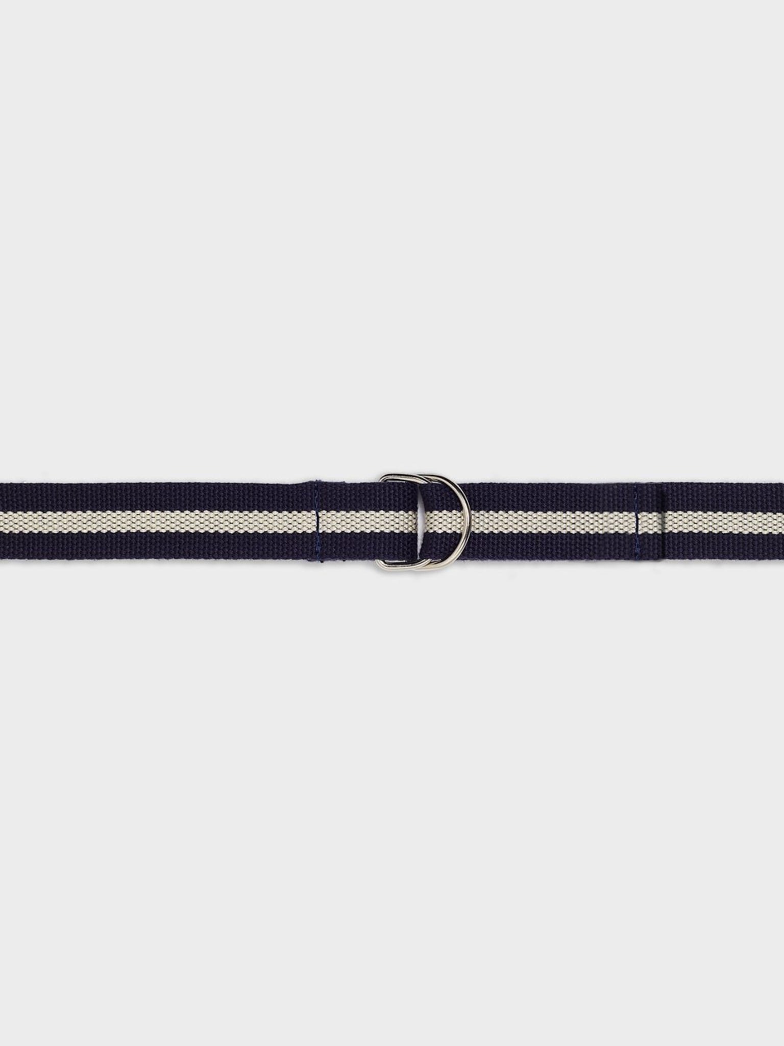 A sleek two-tone webbed belt with premium metallic hardware. The durable D-ring closure system ensures reliable wear while maintaining a polished appearance.
