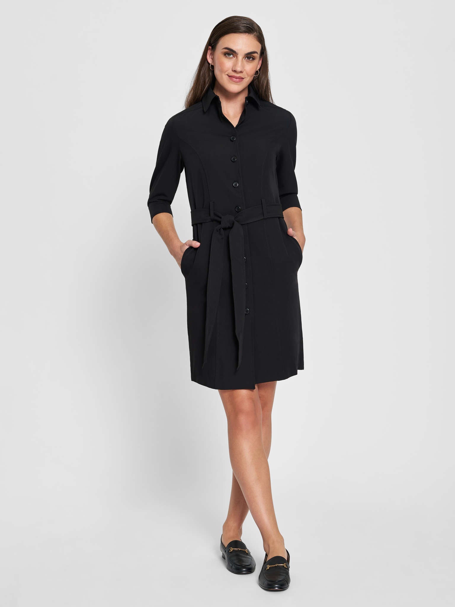 Every girl needs a tailored shirt dress in her career apparel repertoire, and the Bella Dress is your ticket to utility chic. Our version of the shirt dress has crisp clean lines, removable self-fabric belt with thin loops in the front and back 3/4 sleeves that can be rolled up.
