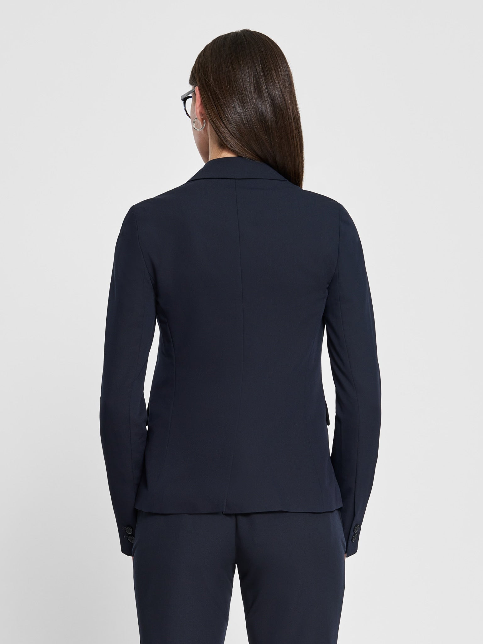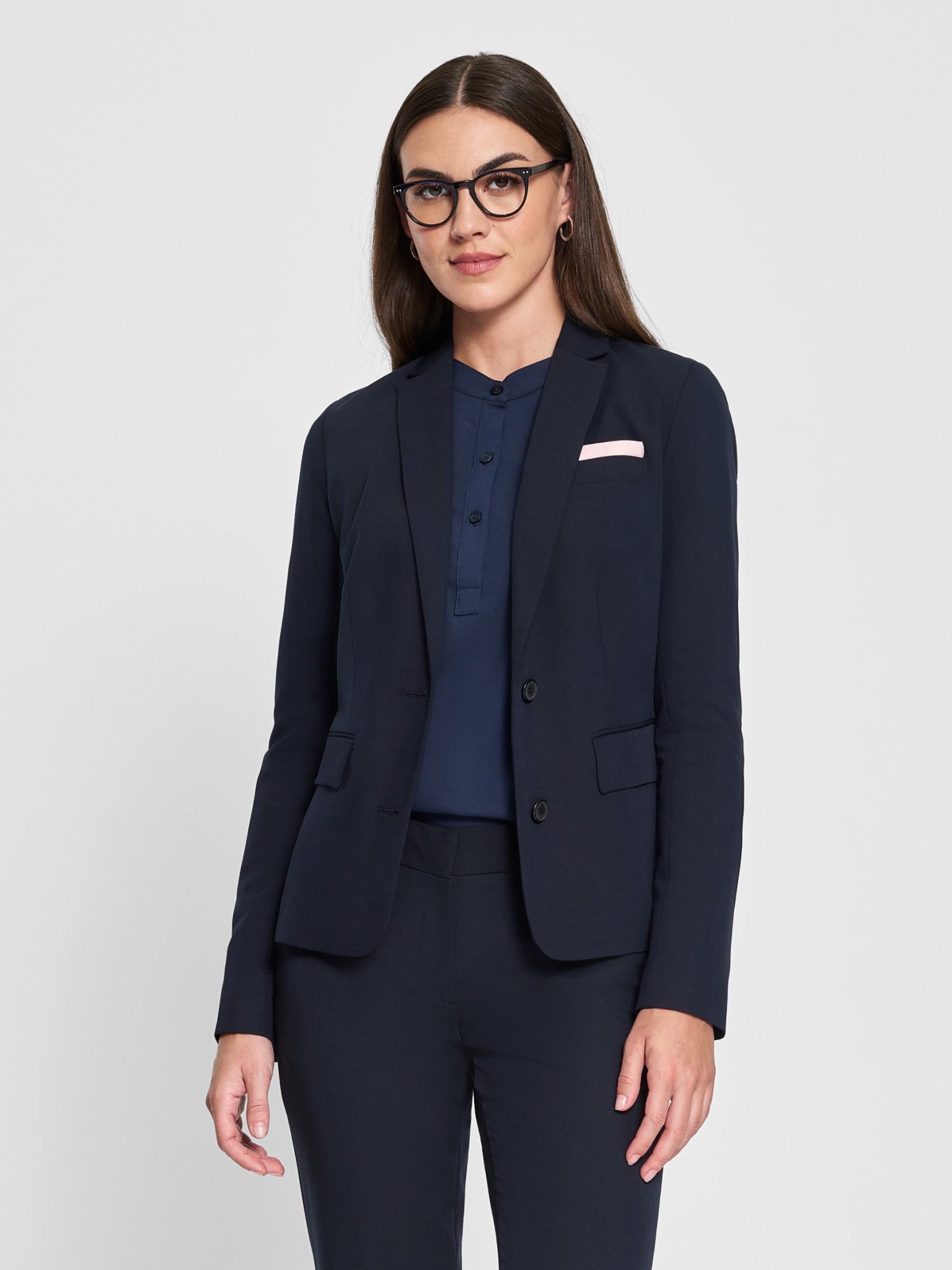 The polished final layer of any look, this blazer is tailored with expert craftsmanship for an impeccable fit. Accented with a breast pocket that can be styled with a feminine pocket square and working buttons at cuff for a rolled sleeve look exposing pinstripe lining.