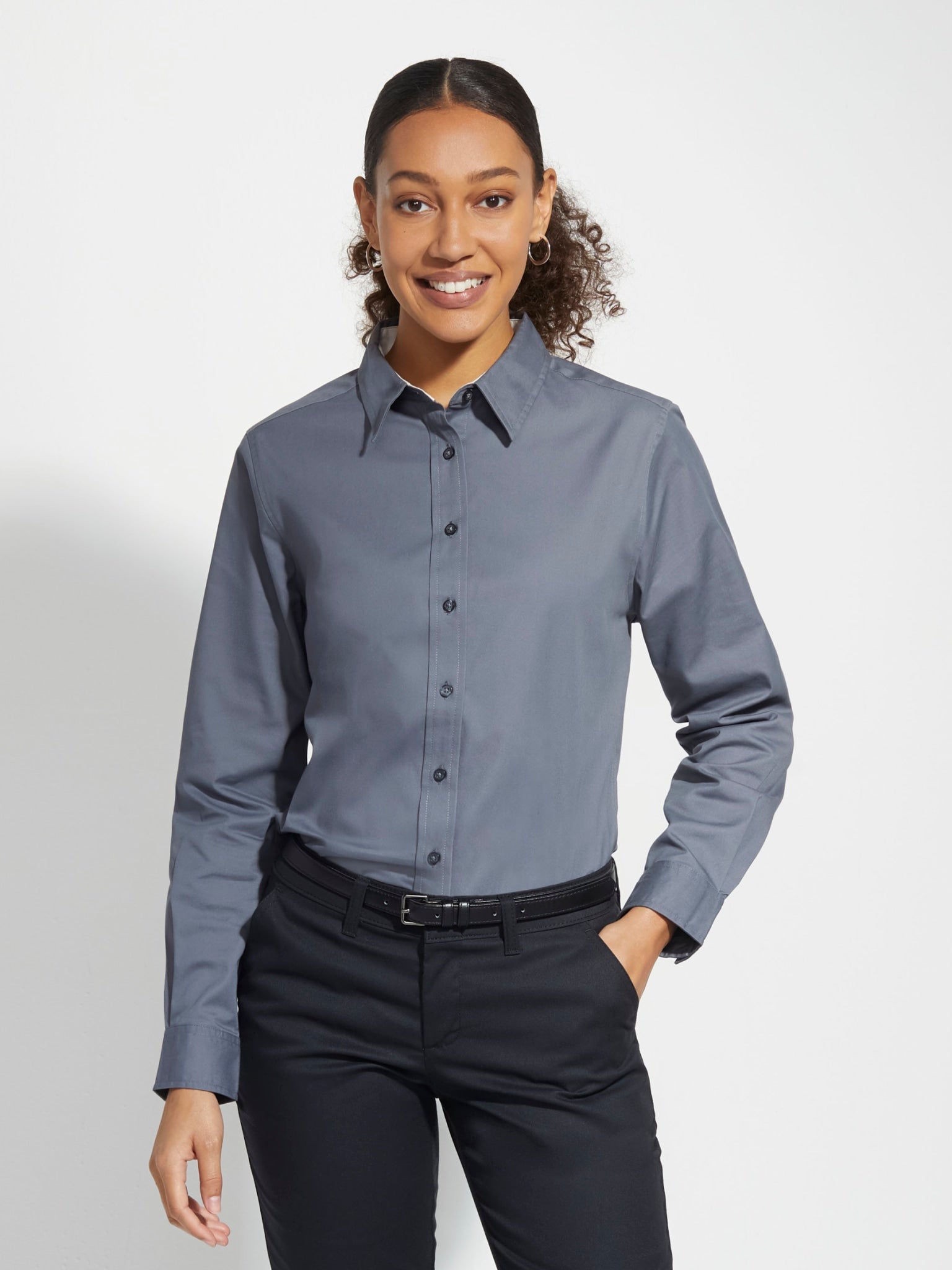 - Open collar design for professional appearance