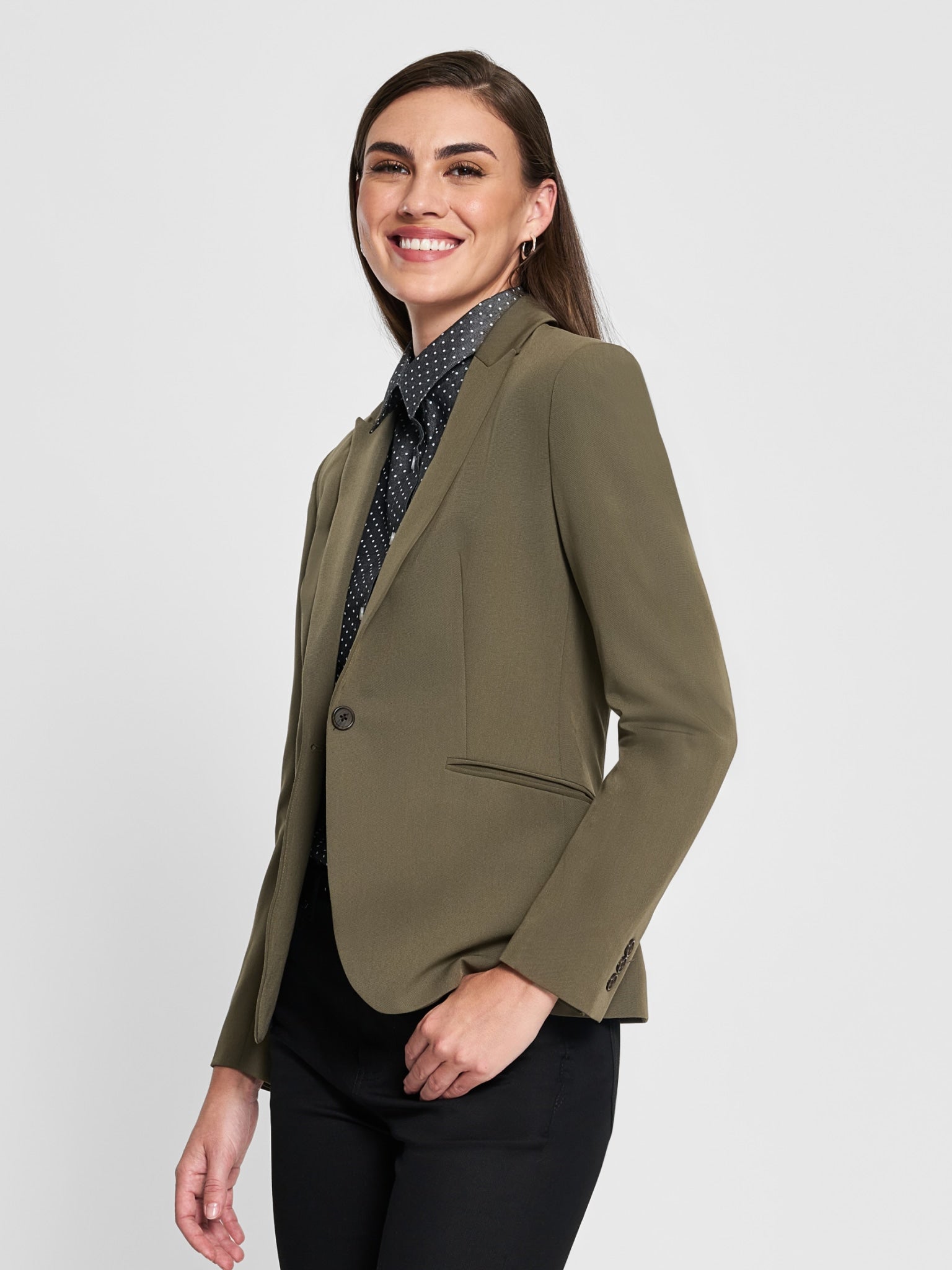 - Single-button closure with fitted feminine silhouette
