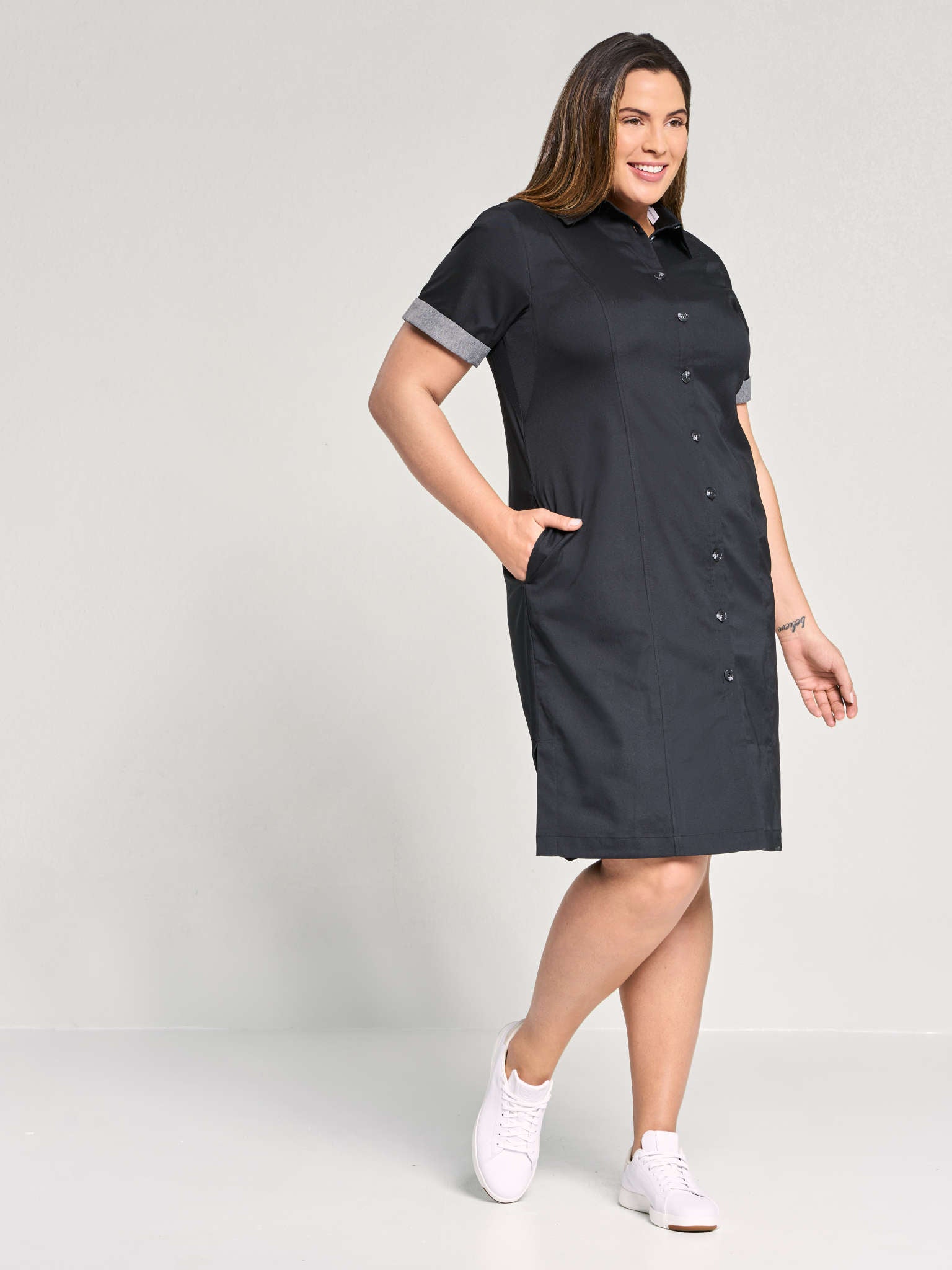A polished sheath dress crafted from performance-ready fabric with professional details like a spread collar and faux button placket. The thoughtful design includes functional touches like media storage pockets and contrast cuffs, making it a versatile choice for the modern workplace.